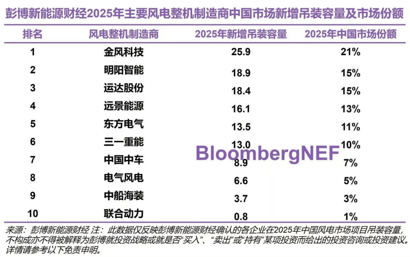 出海方面,彭博新能源财经指出,中国整机制造商加快“走出去”步伐。2025年,彭博新能源财经确认中国整机企业获得近14GW的海外风电整机销售协议,涉及明阳智能、金风科技等多家行业龙头企业。中国整机在全球年度新增订单中的占比由2024年的23%提升至29%。